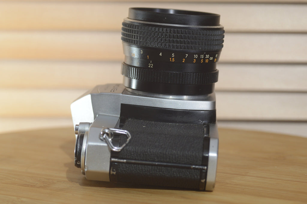 This camera allows one to focus the lens at maximum aperture with a bright viewfinder image. After focusing, a switch on the side of the lens mount stopped the lens down and switched on the metering which the camera displayed with a needle located on the side of the viewfinder. The use of stop-down light metering was at the time revolutionary