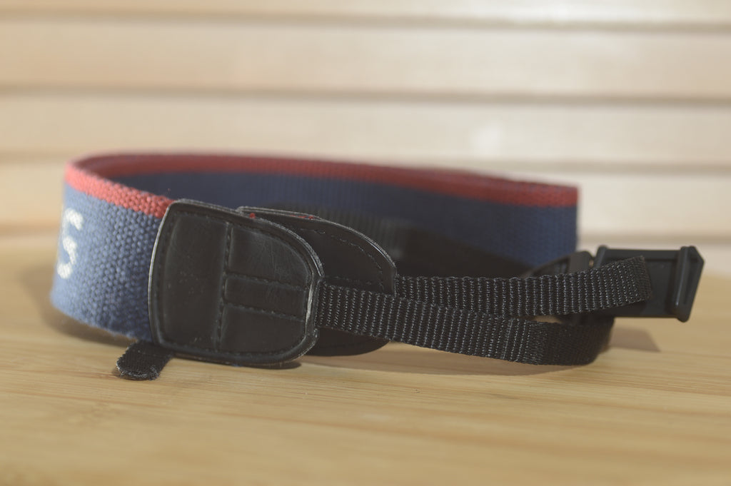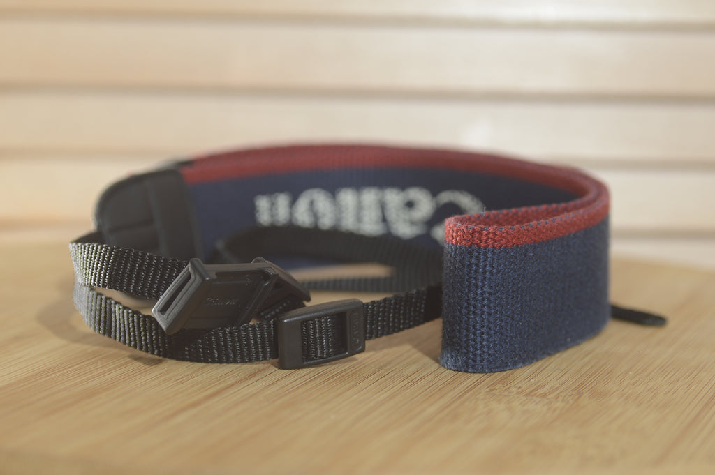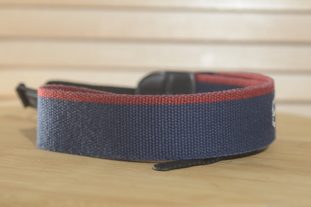 Blue and Red Canon EOS Vintage strap. A lovely addition to your Canon set up.