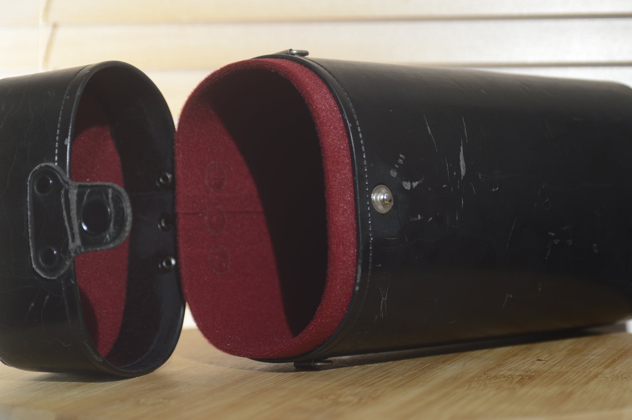 Fits any lens that measures up to 25cmhigh and 12cm wide. Dark red felt lined interior. There are a few scratches and marks on the case but a small amount of leather restorer should bring it back to its former glory.
