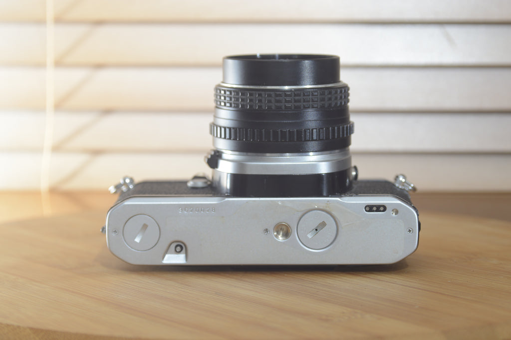 These are fantastic and stylish little 1970s cameras with Pentax K lens mount. View finders has very clear LEDs to show the shutter speeds leaving you to focus and adjust the aperture. They have a lovely look and a large bright view finder. It's a real all-metal camera. The ME Super is a straight-ahead camera that just shoots and doesn't get in your way. they are light and compact but also sturdy little beauties. This is a great starter camera or for the more advanced users with the standard prime lens. Super sharp 50mm .