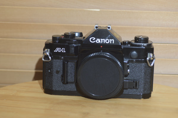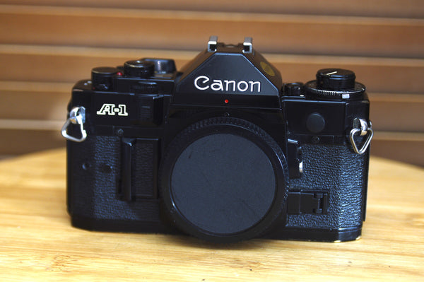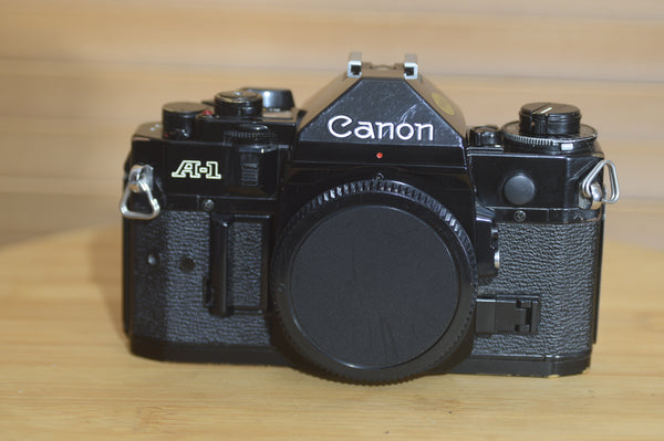 The Canon A-1 is an advanced level single-lens reflex (SLR) 35 mm film camera for use with interchangeable lenses, program mode as well as aperture and shutter speed priority. Fantastic looking cameras that are super collectable and harder to find every day. This is a true legend of its time and you can see why.