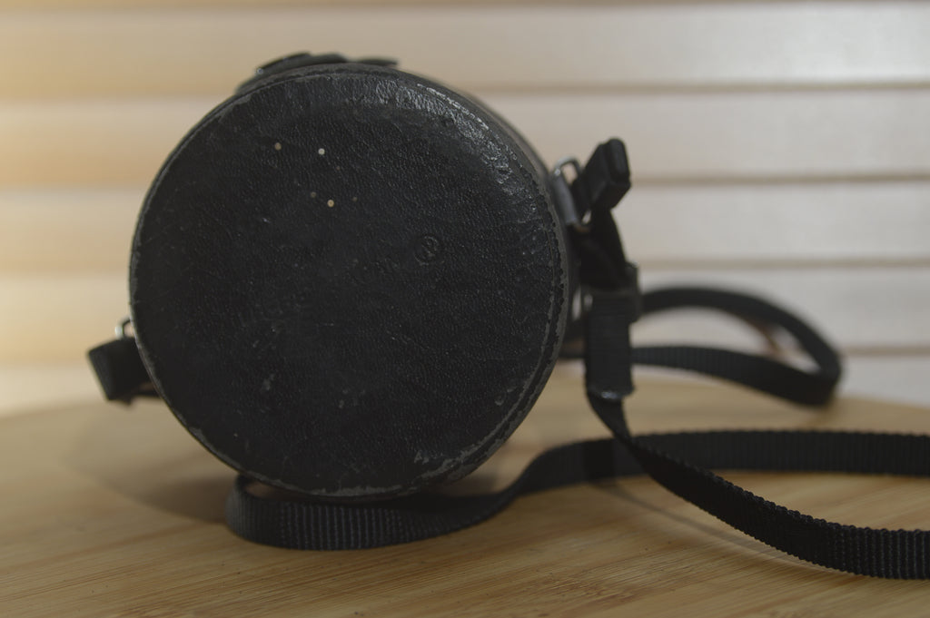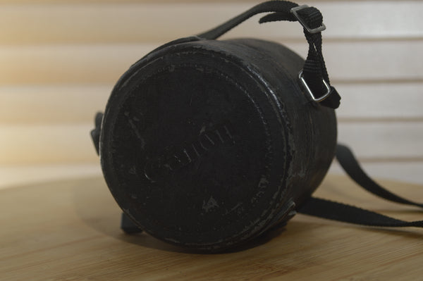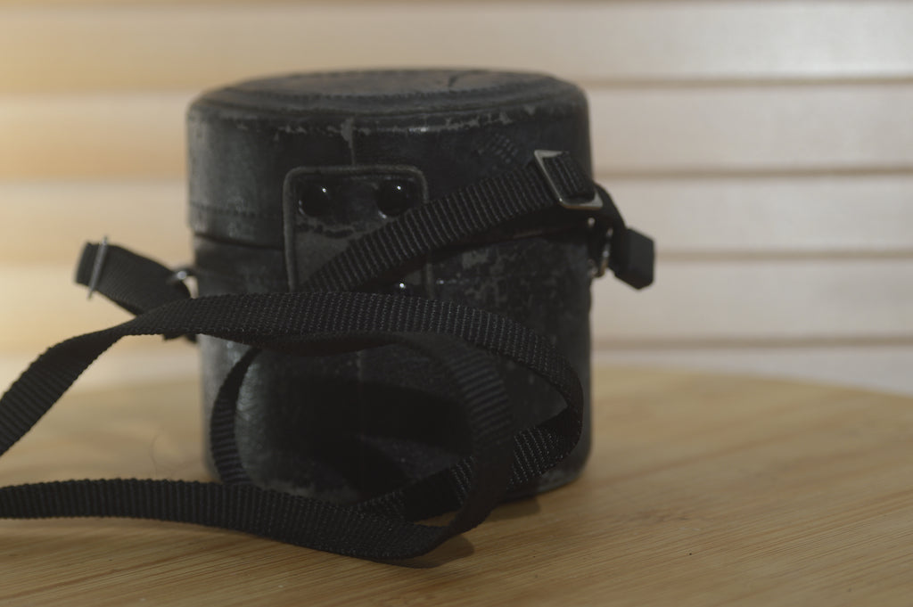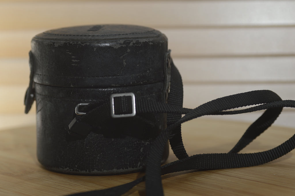 this lovely hard leather case is perfect for protecting your vintage lenses. Ideal for transporting your lens. Built to be durable, secure and easy to use. It has seen some wear and a touch of leather restorer will bring this back to it's former glory.
