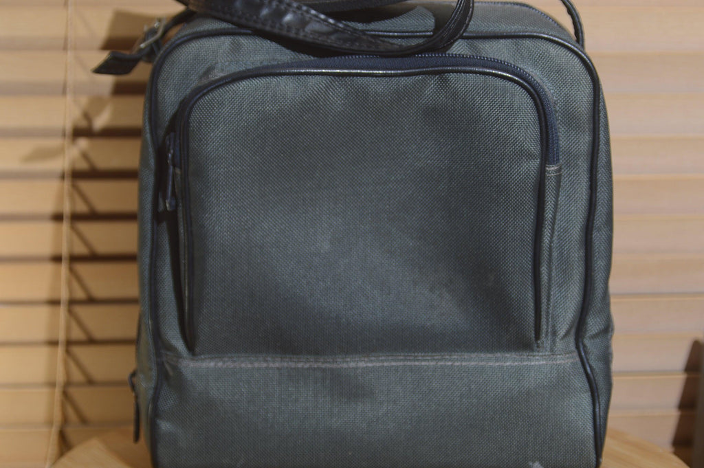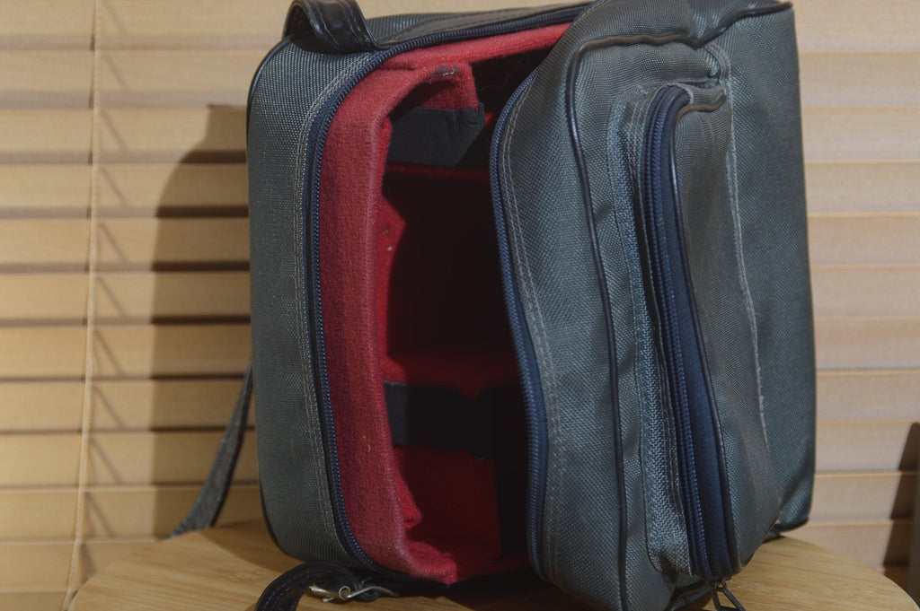 Great condition bag with removable padded dividers. Strap for shoulder or for attaching to belts. Very comfortable and easily washable. Red felt interior. Perfect way to protect your camera bag.