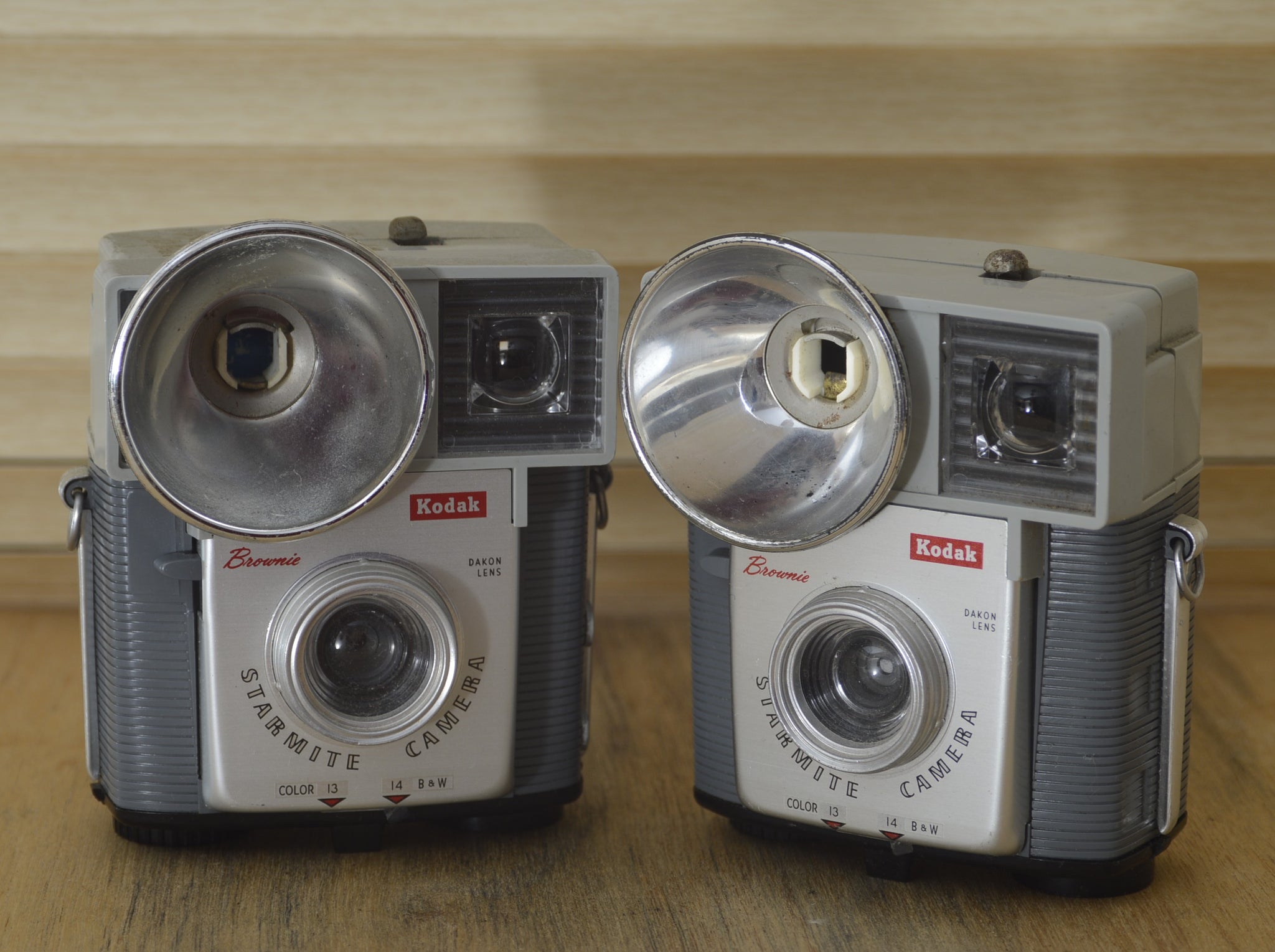 The Brownie Starmite camera featured a molded plastic body and optical direct vision finder. This small camera sported a built-in flash gun.