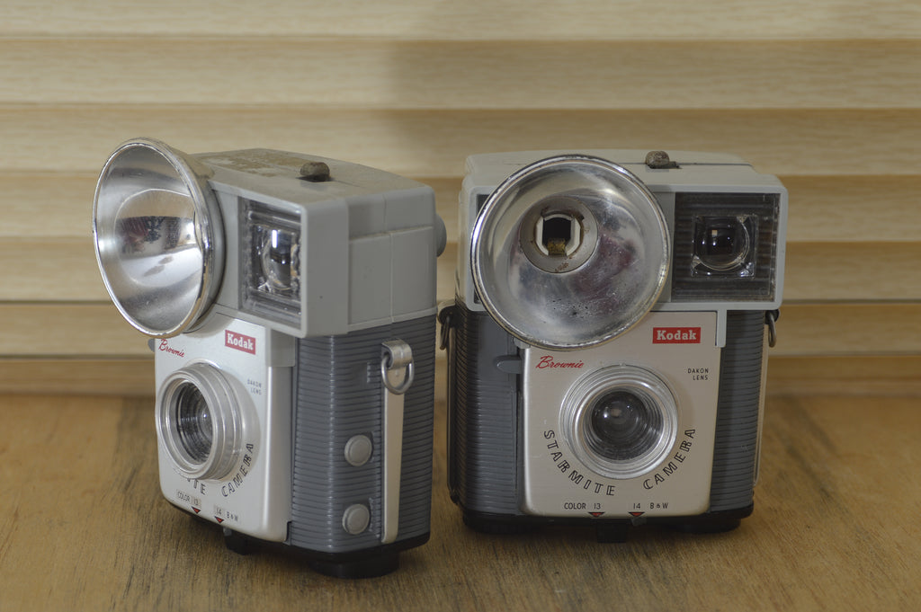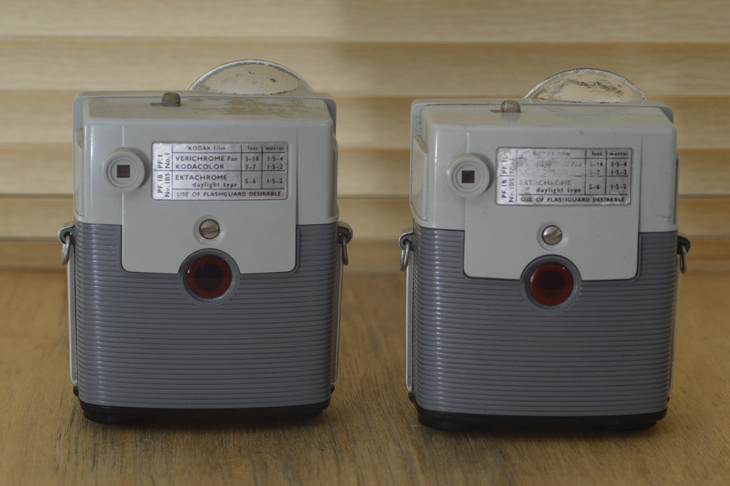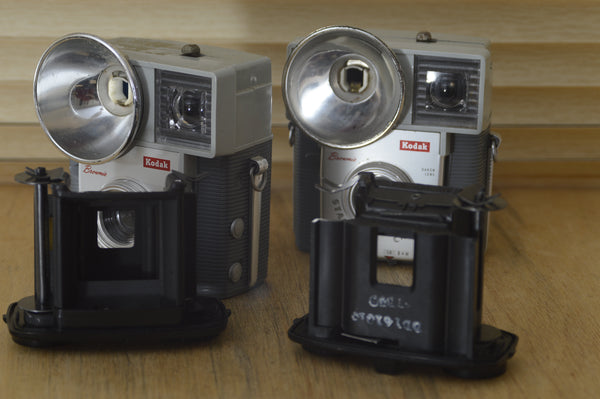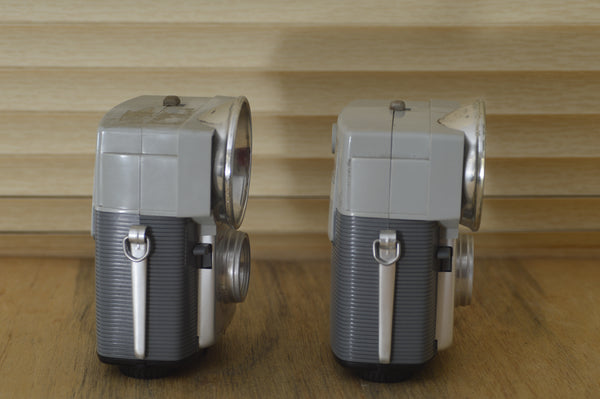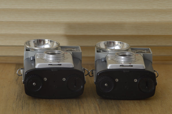 We absolutely love these quirky cameras. They are still working and the film is now widely available. Have them as a pair or singularly. would make for great stage props or as quirky ornaments. To Operate the flash, replacement bulbs will be required.